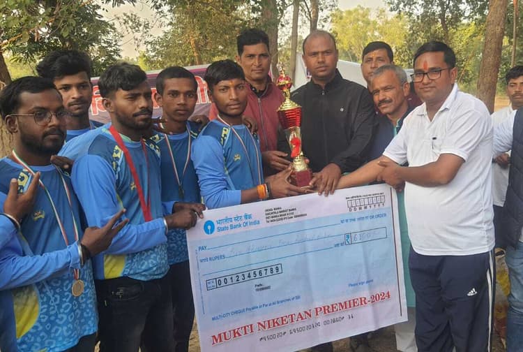 -रोमांचक मुकाबले में नदिया के पार टीम को एक विकेट से दी शिकस्त कटोरिया. कैलाश सत्यार्थी चिल्ड्रेन फाउंडेशन के बाल-विवाह मुक्त भारत अभियान (जस्ट राईट फॉर चिल्ड्रेन ) के तहत मुक्ति निकेतन ग्राउंड पर रविवार को मुक्ति निकेतन प्रीमियर लीग क्रिकेट टूर्नामेंट का फाइनल मैच खेला गया. रोमांचक मुकाबले में दर्वेपट्टी की टीम ने नदिया के पार टीम को एक विकेट से शिकस्त देकर चैंपियन ट्रॉफी पर कब्जा जमाया. अतिथि सह प्रभारी प्रमुख सुरेंद्र प्रसाद यादव, मुक्ति निकेतन के सचिव चिरंजीव कुमार सिंह, पत्रकार विजय आनंद, अध्यक्ष प्रणव कुमार, डीएलएड संकाय के अध्यक्ष विजयानंद सिंह व जिला समन्वयक मनोज कुमार सिंह ने विजेता व उपविजेता टीमों को ट्रॉफी व नकद पुरस्कार देकर सम्मानित किया. विजेता दर्वेपट्टी टीम को चैंपियन ट्रॉफी के साथ 5100 नकद पुरस्कार दिया गया. उपविजेता नदिया के पार टीम को रनर ट्रॉफी व 4100 नकद पुरस्कार मिला. मैन ऑफ दी मैच एवं मैन ऑफ दी सीरिज विजेता टीम के बबलू कुमार को दिया गया. फाइनल मैच में हैट्रिक विकेट सहित सर्वाधिक 5 विकेट लिए व 17 रनों का योगदान भी किया. टूर्नामेंट के तीन मैच में कुल 140 रन व दस विकेट लेकर टीम को जीत दिलाई. -टॉस जीतकर नदिया के पार ने की पहले बल्लेबाजी फाइनल मैच के शुरू होने से पहले मैदान पर सामूहिक रूप से राष्ट्र गान गाए गए. फिर टॉस जीतने के बाद नदिया के पार की टीम ने पहले बल्लेबाजी करने का निर्णय लिया. 16 ओवर के मैच में सभी विकेट खोकर 131 रन बनाई. जवाबी पारी में दर्वेपट्टी ने 15 ओवर एक गेंद पर 9 विकेट के नुकसान पर ही लक्ष्य हासिल कर चैंपियन ट्रॉफी पर कब्जा जमा लिया. अंपायर राहुल कुमार व राजेश कुमार थे जबकि स्कोरिंग गूंजन सिंह ने की. कॉमेंट्री विजय कुमार व पांडव शर्मा ने किया. नंदन कुमार, ज्योतिष कुमार, अरविंद कुमार, रंजीत कुमार सिंह के अलावा मुक्ति निकेतन के सभी वॉलेंटिरयर मौजूद थे.