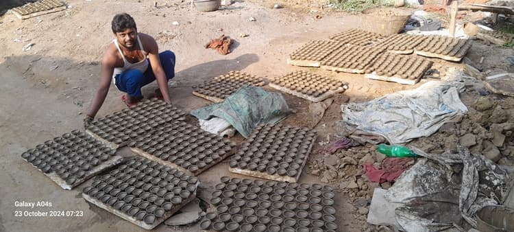 पंजवारा. दीपावली को कुछ दिन रह गये हैं. इसके साथ ही कुम्हारों के चाक की रफ्तार तेज हो गयी है. आसपास के क्षेत्रों में मिट्टी के बर्तन बनाने वाले दिन रात जुटे हुए हैं. कुम्हारों को उम्मीद है कि प्रधानमंत्री की अपील के असर से उनकी भी अच्छी दीवाली रहेगी. लोग चाइनीज झालरों का बहिष्कार कर दीयों से घरों को सजायेंगे. आधुनिकता के इस दौर में मिट्टी के दीये की पहचान बरकरार रखने के कारण कुम्हारों को इस बार भी कुछ कमाई की उम्मीद जगी है. पहले तो लोग भूल चुके हैं, लेकिन प्रधानमंत्री नरेंद्र मोदी ने लोगों को पारंपरिक चीजों को अपनाने को कहा. इसके बाद ही इसका असर देखा गया. वहीं पिंटू कुमार पंडित ने कहा कि मेरे पास काफी आर्डर आये हैं. 200 दीयों के दो आर्डर बाजार में पहुंचा दिए हैं. पैसे भी ठीक मिले हैं. पहले चाइनीज झालरों ने दीयों को अंधेरे में धकेल दिया था. दीये पर्यावरण को भी नुकसान नहीं पहुंचाते हैं. उसी क्षेत्र की एक अन्य पुरण पंडित ने कहा कि मिट्टी का दीपक जलाने से घर में सुख समृद्धि आती है. हम दीये को बेहतर डिजाइन देकर बनाते हैं. घर खर्च भी इसी के सहारे चलता है. अब लोग मिट्टी के दीयों की तरफ आकर्षित हो रहे हैं.