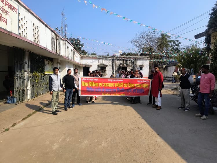 बांका. बिहार चिकित्सा एवं जनस्वास्थ्य कर्मचारी संघ जिला इकाई के तत्वावधान में शनिवार को प्रदेश संगठन के आह्वान पर विभिन्न मांगों को लेकर सीएस के समक्ष प्रदर्शन किया. इस कार्यक्रम की अध्यक्षता अध्यक्ष सनत कुमार ठाकुर ने किया. प्रदर्शन सभा को संबोधित करते हुए जिला मंत्री रोहित कुमार ने सरकार से पुरानी पेंशन बहाल, सभी स्वास्थ्य कर्मियों के लिए जिला संवर्ग घोषित करने, जीएनएम व एएनएम की सेवा संपुष्टि, एसीपी व एमएसीपी को स्वीकृत करने की मांग प्रमुखता से रखी. साथ ही सीएस से मिलकर 22 सूत्री मांग से संबंधित ज्ञापन विभागीय सचिव को सौंपा. इस मौके पर ममता कुमारी, रेखा कुमारी, सुधा कुमारी, निशा कुमारी, जूली टुडू, शोभ सिन्हा, संगीता कुमारी, लक्ष्मी कुमारी, राजेश चौधरी, जया पांडेय, शिवनंदन हांसदा, नीतीश कुमार, आशुतोष कुमार राय, आदित्य कुमार, सत्यजीत मनहर सहित अन्य कर्मचारी प्रमुख रूप से मौजूद थे.