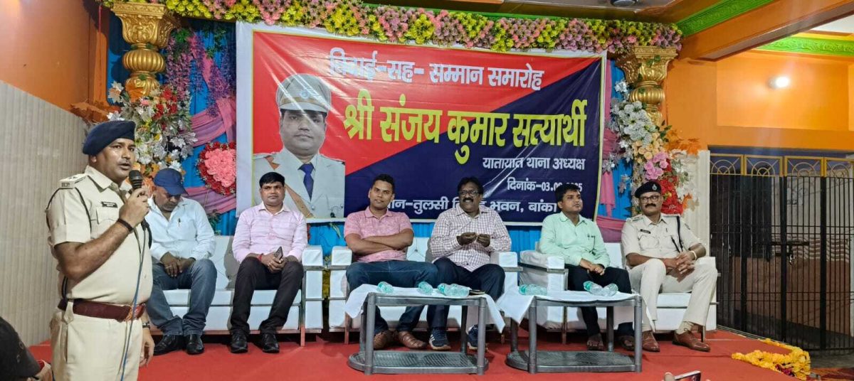 बांका. शहर स्थित तुलसी विवाह भवन में रविवार को विदाई सह सम्मान समारोह का आयोजन हुआ. मालूम हो कि यातायात थानाध्यक्ष संजय सत्यार्थी का तबादला सहरसा हो जाने के बाद उनके स्वागत को लेकर समारोह का आयोजन किया गया. इस क्रम में स्थानांतरित थानाध्यक्ष को एसडीओ राजकुमार, एसडीपीओ अमर विश्वास, डीएसपी मुख्यालय, साइबर डीएसपी, यातायात डीएसपी नीरज कुमार व सदर थानाध्यक्ष राकेश कुमार सहित अन्य गणमान्य लोगों द्वारा माला पहनाकर एवं बुके व उपहार देकर विदाई दी गयी. वहीं यातायात डीएसपी ने कार्यक्रम को संबोधित करते हुए कहा कि संजय सत्यार्थी का कार्यकाल सराहनीय रहा, जो कभी भुलाया नहीं जा सकता. जबकि मौके पर उपस्थित अन्य पदाधिकारी ने भी उनके कार्यकाल को सराहनीय कहा. इस मौके पर सदर थाना से ब्रजेश कुमार, सुनील कुमार, यातायात थाना के प्रमोद कुमार सहित भारी संख्या में पुलिस पदाधिकारी व कर्मी मौजूद थे.