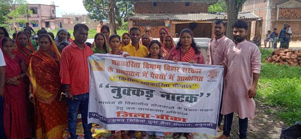 चांदन. सहकारिता विभाग बिहार सरकार के तत्वाधान में प्रखंड क्षेत्र के चांदन, बिरनियां, सिलजोरी, कोरिया, गौरीपुर व दक्षिणी बारने पंचायत में सहकारिता चौपाल नुक्कड़ नाटक का आयोजन कर विभागीय योजनाओं का प्रचार-प्रसार व जागरूकता अभियान चलाया गया. प्रखंड के आधा दर्जन पंचायतों में आयोजित इस चौपाल में प्रणव मिथिला युवा सेवा संस्थान मधुबनी के टीम लीडर मृत्युंजय कुमार के नेतृत्व में साथी कलाकारों ने अपने अभिनय के माध्यम से किसानों के लिए सहकारिता विभाग द्वारा चलाये जा रहे विभिन्न कल्याणकारी योजनाओं की जानकारी दी. नुक्कड़ नाटक के माध्यम से कलाकारों ने सहकारिता विभाग की पैक्स की ओर से बिहार राज्य फ़सल सहायता योजना, खाद्यान्न अधिप्राप्ति, प्रधानमंत्री क़ृषि सम्मान योजना, मुख्यमंत्री हरित कृषि संयंत्र योजना, पैक्सों में पेट्रोल-डीजल आउटलेट की स्थापना, कोऑपरेटिव बैंक से किसान क्रेडिट कार्ड ऋण, जमा वृद्धि योजना, बहुराज्यीय सहकारी समितियों की जानकारी, मत्स्यजीवी सहकारी समिति एवं बुनकर हस्तकरघा व सब्जी प्रसंस्करण एवं विकास जैसी योजनाओं की जानकारी दी गयी. नुक्कड़ नाटक के सफल आयोजन व क्रियान्वयन में पैक्स अध्यक्ष चांदन बैजनाथ यादव, टीम के कलाकार कन्हैया कु झा, योगेंद्र राम, स्वाति कुमारी, बेबी पाण्डेय व अनन्या झा की भूमिका अहम रही.