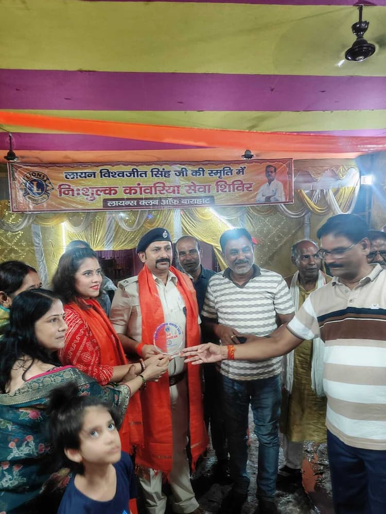 पंजवारा. लायंस क्लब बाराहाट की ओर से रविवार की रात लायन विश्वजीत सिंह की स्मृति में आयोजित निःशुल्क कांवरिया सेवा शिविर लगाया गया. शिविर में महिला टीम की सक्रिय भागीदारी देखने को मिली. महिला सदस्यों ने मिलकर डाक बम कांवरियों की सेवा की. प्राथमिक चिकित्सा व विश्राम की भी व्यवस्था की गयी थी. इस अवसर पर जिला परिषद सदस्य नीलम सिंह, बाराहाट थानाध्यक्ष महेश कुमार व धर्मपत्नी स्नेहा कुमारी को लायन क्लब के अध्यक्ष धर्मेंद्र सिंह के नेतृत्व में अतिथियों को अंग वस्त्र व सेवा के 25 वर्ष पूर्ण होने की स्मृति में प्रतीक चिन्ह भेंटकर सम्मानित किया. कार्यक्रम में लायन राजीव लोचन मिश्रा, जोन चेयरमैन भवानंद सिंह, सुरेश यादव, समीर सिंह, अजय चौधरी, मनोज चौधरी, विश्वनाथ सिंह, डॉ लक्ष्मण पंडित, लायन रंजना सिंह, लायन महिला सदस्य समेत कई गणमान्य उपस्थित रहे.