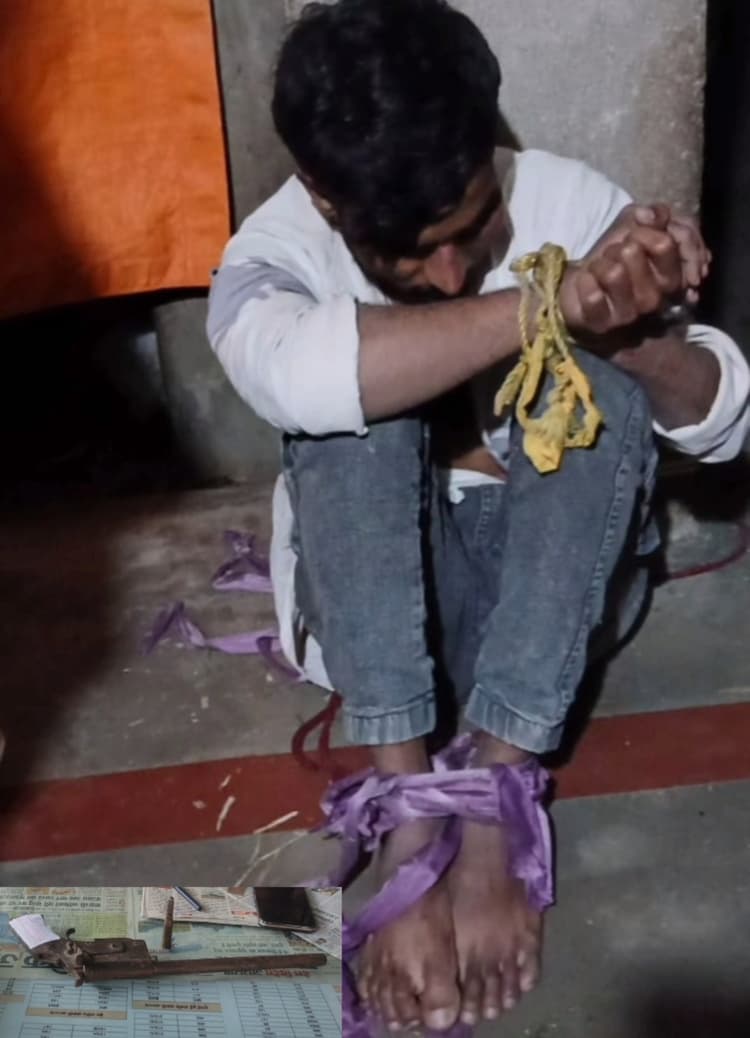 जानकारी के अनुसार, बेलारी गांव निवासी मो मुदस्सिर पिता मो मुजम्मिल के घर में गांव के ही मो एजाज उर्फ अनमोल पिता मो महफूज सोमवार की रात संदिग्ध परिस्थिति में घुस गया. घरवालों की नजर पड़ते ही युवक बचने के लिए पलंग के नीचे छिप गया. परिजनों ने शोर मचाया तो आसपास के ग्रामीण मौके पर पहुंच गये और खोजबीन कर युवक को पकड़ लिया. तलाशी के दौरान उसके पास से देसी कट्टा और जिंदा कारतूस मिलने की बात कही जा रही है. हथियार मिलने की खबर फैलते ही ग्रामीणों का गुस्सा भड़क उठा और लोगों ने युवक को बंधक बनाकर उसकी पिटाई कर दी. हालांकि पकड़े गये युवक के परिजन और उसके साथ कुछ ग्रामीणों ने बंधक बनाये युवक को जबरन छुड़ाने का प्रयास किया, लेकिन वह सफल नहीं हो सके. बाद में स्थिति बिगड़ती देख पुलिस को सूचना दी गयी, जिसके बाद शंभुगंज थाने की टीम मौके पर पहुंची और आरोपी को हिरासत में ले लिया.घर में घुसे युवक को कट्टा व कारतूस के साथ पकड़ा, बंधक बनाकर पीटा