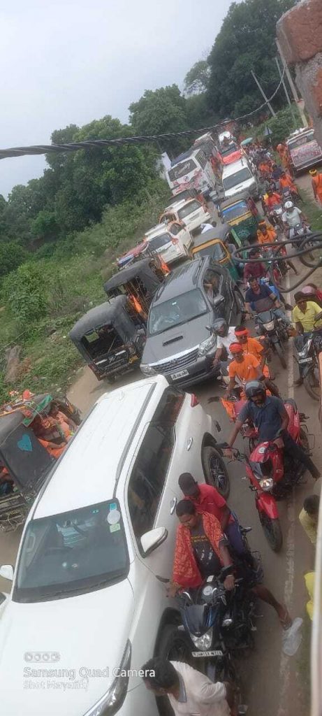 चांदन. श्रावणी मेला के तीसरी सोमवारी को भी बाबा बैद्यनाथ पर जलार्पण करने को लेकर सुल्तानगंज से छोटी-बड़ी वाहनों एवं बाइक की संख्या में अप्रत्याशित वृद्धि के कारण चांदन-देवघर मार्ग पर सोमवार को भी दोपहर तक जाम की स्थिति बनी रही. जाम में फंसे वाहनों पर सवार लोग उमस भरी गर्मी में परेशान रहे. जाम के दौरान ओवरटेक के चक्कर में स्थिति और गंभीर होती रही. हालांकि एसडीएम व डीटीओ ने कई वाहनों का चालान भी काटा. चांदन थानाध्यक्ष विष्णुदेव कुमार व अपर थानाध्यक्ष रवींद्र कुमार गश्ती के दौरान माइकिंग कर वाहन चालकों से कतारबद्ध होकर आगे बढ़ने की अपील करते रहे.