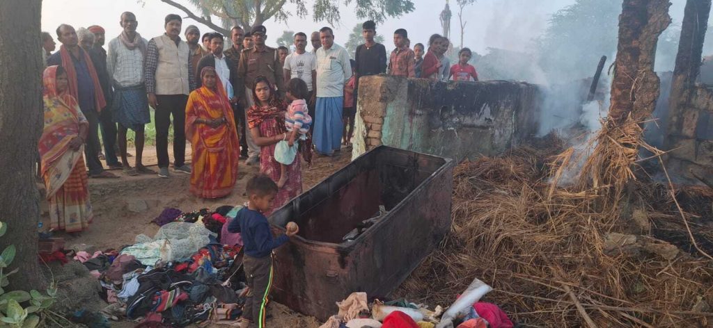 बांका/रजौन. प्रखंड के पड़घड़ी-लकड़ा पंचायत अंतर्गत झिकटा ग्राम निवासी सह पूर्व पंचायत समिति सदस्य मुन्नी देवी एवं राजनंदनी देवी सहित दो परिवारों के मिट्टी व फुस का घर शुक्रवार की दोपहर अचानक आग लगने से खाक हो गया. इस घटना में घर के अंदर का सारा समान जलकर नष्ट हो गया. मौके पर स्थानीय लोगों ने आग बुझाने की पुरजोर कोशिश की, लेकिन आग इतनी विकराल थी कि किसी की एक न चली. लोगों ने मौके पर अग्निशमन विभाग को जानकारी दी लेकिन अग्निशमन वाहन के पहुंचने के पूर्व सबकुछ जलकर राख हो चुका था, हालांकि दमकल की मदद के बाद आग पर काबू पाया गया. पीड़ित रामधारी पासवान व उनकी पत्नी मुन्नी देवी एवं विवेक पासवान व उनकी पत्नी राजनंदनी देवी पूरी तरह से बदहवास हो गयी है. इधर मुखिया प्रतिनिधि मनोज सिंह ने मौके पर पहुंचकर दोनों परिवारों को ठंड के मौसम के अनुरूप अस्थाई टेंट रूपी आवास, दरी, बेडशीट, तकिया, कंबल, कपड़ा, आवश्यक बर्तन, कपड़ा, खाद्य पदार्थ सहित अन्य राहत सामग्री की व्यवस्था कर दी है. समाजसेवी प्रिंस कुमार ने भी अपनी ओर से अग्निपीड़ित परिवार के बीच 50 किलो चावल और 25 किलो गेहूं उपलब्ध कराया है. इधर घटना की सूचना के बाद मौके पर हल्का राजस्व कर्मचारी लाला कुमार ने बताया कि इस आगलगी की घटना को लेकर दोनों अग्निपीड़ित परिवारों ने रजौन सीओ के नाम दो अलग-अलग आवेदन देकर उचित मुआवजा दिलाने की गुहार लगायी है. अग्निपीड़ित पूर्व पंसस मुन्नी देवी, पति रामधारी पासवान ने अपने आवेदन में बताया है कि शुक्रवार की दोपहर करीब 2 बजे उनके घर में अचानक आग लग गयी.