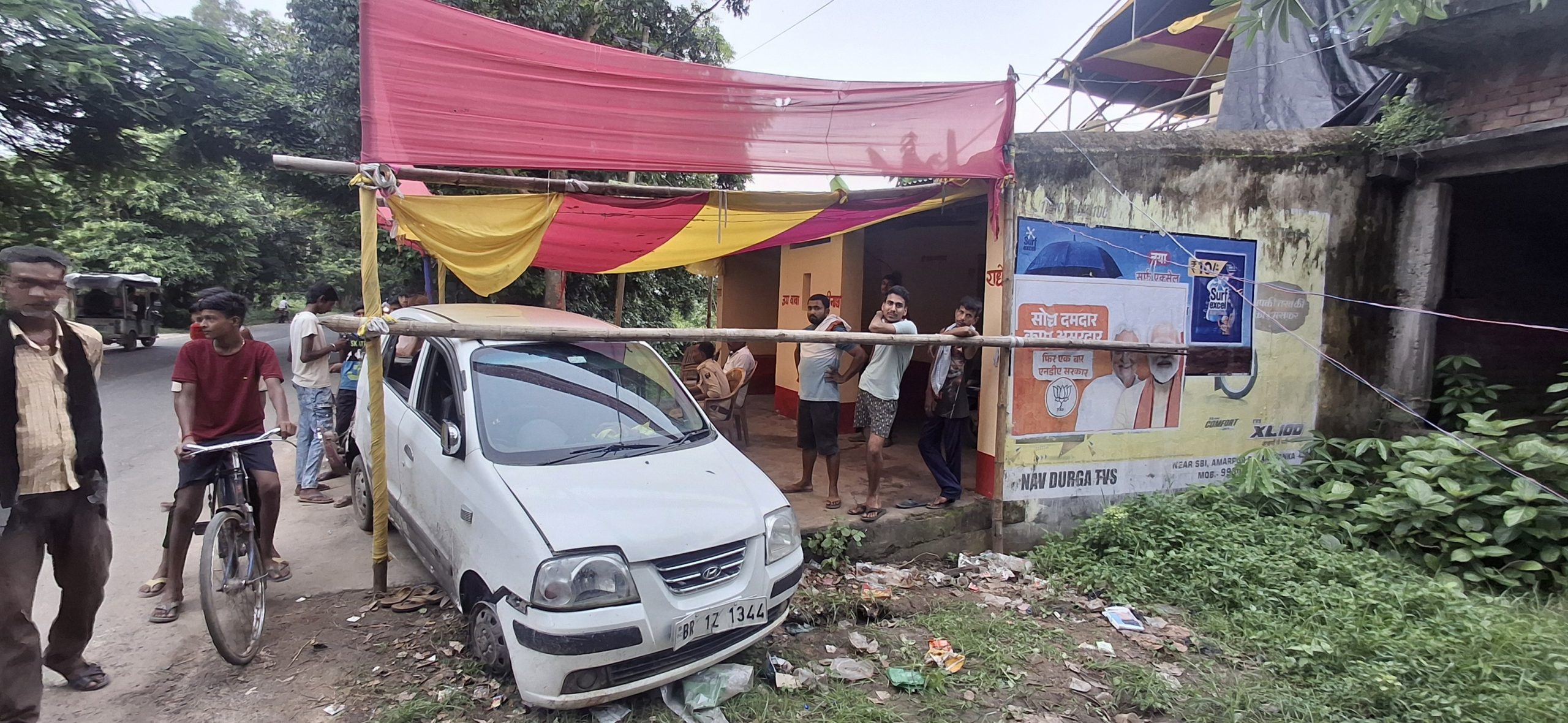 अमरपुर. अमरपुर-बांका मुख्य पथ पर खेमीचक गांव के समीप गुरुवार को एक अनियंत्रित कार कांवरिया टेंट में घुस गयी. जिससे कुछ देर तक वहां अफरा-तफरी का माहौल बना रहा है. हालांकि घटना में जान माल की कोई क्षति नही हुई है. सभी बाल-बाल बच गये. घटना के बाद चालक मौके पर ही कार छोड़कर फरार हो गया. प्रत्यक्षदर्शियों के अनुसार कार बांका की ओर से तेज गति से अमरपुर की ओर आ रही थी. तभी इंगलिशमोड़ चौक के समीप कार अनियंत्रित होकर सड़क किनारे अवस्थित बिजली के खंभे में टक्कर मार दी. टक्कर लगते ही कार चारों तरफ अनियंत्रित होकर घुमने लगी. इस दौरान कार का एक चक्का पंगस्चर हो गया. कार पेंचर होने के बाद भी चालक वाहन को तेजगति से लेकर अमरपुर की ओर भागने लगा. इस दौरान एक टोटो व बाइक भी कार की चपेट में आने से बाल-बाल बच गये. थोड़ी दूर जाने के बाद कार का टायर फटकर चक्के से बाहर निकल गया और कार खेमीचक गांव के समीप दिलीप उपाध्याय के मकान के आगे लगे कांवरिया टेंट में घुस गयी. घटना की सूचना मिलते ही पुलिस घटना स्थल पर पहुंच कर दुर्घटनाग्रस्त कार को जब्त कर लिया है.