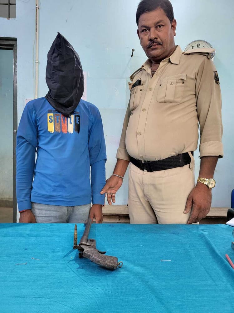 अमरपुर. अमरपुर-शाहकुंड मुख्य मार्ग पर चतुर्वेदी आश्रम के समीप प्रभारी थानाध्यक्ष विक्की कुमार के द्वारा बाइक सवार एक युवक को देसी पिस्तौल व जिंदा कारतूस के साथ गिरफ्तार किया गया. गिरफ्तार युवक कुल्हड़िया रहीमगंज निवासी रुपेश तांती बताया जा रहा है. प्रभारी थानाध्यक्ष ने बताया कि रविवार की रात्री उन्हें गुप्त सूचना मिली कि पवई चौक पर कुछ अपराधी किस्म के लोग किसी बड़ी घटना को अंजाम देने कि फिराक में जुटे हुये हैं. सूचना मिलते ही एक टीम का गठन कर पवई चौक की तरफ छापामारी अभियान चलाया गया. इसी दौरान कुछ युवक पुलिस वाहन को देखकर बाइक से अमरपुर की ओर भागने लगे. पुलिस ने खदेड़ कर चतुर्वेदी आश्रम के समीप एक बाइक सवार युवक को पकड़ लिया गया. अन्य युवक अंधेरे का फायदा उठाते हुए फरार होने में कामयाब हो गया. बाइक सवार युवक की तालाशी के क्रम में उनके पास से एक देसी पिस्तौल व जिंदा कारतूस बरामद हुआ. मौके पर पुलिस ने युवक को गिरफ्तार करते हुये बरामद पिस्तौल, कारतूस व बाइक को जब्त कर लिया. गिरफ्तार युवक के विरुद्ध आर्म्स एक्ट के तहत प्राथमिकी दर्ज करने की प्रक्रिया की जा रही है. छापेमारी टीम में दारोगा राहुल सिंह व सतीश सिंह दल बल के साथ शामिल थे.