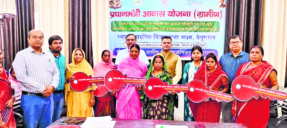 प्रधानमंत्री आवास योजना (ग्रामीण) के तहत बेगूसराय जिले के 2,770 लाभुकों को प्रथम किश्त के रूप में (ग्यारह करोड़ आठ लाख रुपये) प्रदान किया गया. पटना से आयोजित कार्यक्रम का सीधा लाइव वीडियो कारगिल भवन में दिखाया गया. डीएम तुषार सिंगला ने बरौनी प्रखंड के कुल 30 लाभुकों के बीच स्वीकृति पत्र एवं 20 लाभुकों जिन्होंने अपना आवास पूर्ण कर लिया है उन्हें गृह प्रवेश के लिये सांकेतिक चाभी प्रदान किया. डीएम ने कहा कि इससे पूर्व माह सितंबर- 2024 में सिंगल क्लिक के माध्यम से बेगूसराय जिला के 7,948 लाभुकों को 40,000 रुपये प्रति लाभुक के अनुसार प्रथम किस्त के रूप में 31,79,20,000 (इक्तिस करोड़ उनासी लाख बीस हजार रपये) तथा 5 मार्च 2025 को बेगूसराय जिले में 14,599 लाभुकों को प्रथम किस्त के रूप में 58,39,60,000 (अनठावन करोड़ उनचालीस लाख साठ हजार) रूपया उपलब्ध कराया गया था. बेगूसराय जिले को 2024-25 में अतिरिक्त लक्ष्य के रूप में 21,137 लक्ष्य प्राप्त हुआ है. डीएम ने प्रधानमंत्री आवास योजना ग्रामीण के स्वीकृति पत्र प्राप्त करने वाले लाभुकों को आवास निर्माण कार्य शुरू करने को कहा ताकि सरकार द्वारा उन्हें द्वितीय एवं तृतीय किश्त की राशि भी ससमय उपलब्ध कराया जा सके. डीएम ने बताया कि 31 मार्च तक प्रधानमंत्री आवास योजना में नाम जोड़ने का कार्य किया जा रहा है. किसी भी परिस्थिति में दलित, महादलित के साथ-साथ योग्य लाभुकों का नाम नहीं छूटे इसके लिए प्रत्येक दिन समीक्षा करने का निर्देश संबंधित पदाधिकारी को दिया. इस मौके पर डीडीसी सोमेश बहादुर माथुर, निदेशक डीआरडीए विवेक कुमार समेत संबंधित पदाधिकारी एवं प्रतिनिधि मौजूद थे. डीएम ने कहा, किसी को एक पैसे देने की जरूरत नहीं : प्रधानमंत्री आवास योजना के तहत लाभुकों को सांकेतिक चाभी प्रदान करते समय डीएम तुषार सिंगला ने लाभुकों को कहा कि किसी को भी एक पैसे देने की जरूरत नहीं है. जो कोई भी कर्मी अथवा पदाधिकारी आवास के नाम पर पैसे की मांग करें तुरंत हमें सूचित करें. डीएम ने कहा कि अब तक तीन से चार आवास सहायक को लाभुकों से पैसे मांगने के आरोप में कार्य से निष्कासित किया गया है. डीएम ने कहा कि जो भी पात्र लाभुक हैं, उन्हें आवास बिना एक पैसे के आवास मिलेगा.डिस्क्लेमर: यह प्रभात खबर समाचार पत्र की ऑटोमेटेड न्यूज फीड है. इसे प्रभात खबर डॉट कॉम की टीम ने संपादित नहीं किया है