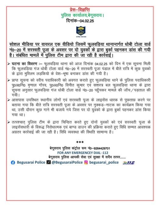 पुलिस ने जानकारी देते हुए लिखा कि सोशल मीडिया पर वायरल एक वीडियो जिसमें फुलवड़िया थानान्तर्गत धोबी टोला वार्ड नंबर 20 में सरस्वती पूजा के अवसर पर दो युवकों के द्वारा बुर्का पहनकर डांस किया गया है. संबंधित मामले में पुलिस टीम द्वारा कार्रवाई की जा रही है. पुलिस ने आगे बताया कि मामले की सूचना मिलते ही वरीय पदाधिकारी को अवगत कराते हुए फुलवड़िया थाने के पुलिस पदाधिकारी पुलिस अवर निरीक्षक मृणाल गौरव, पुलिस अवर निरीक्षक विनीत कुमार एवं सशस्त्र बल फुलवड़िया थाना के द्वारा सूचना के अनुसार मौके पर पहुंचकर मामले की जांच की गई.