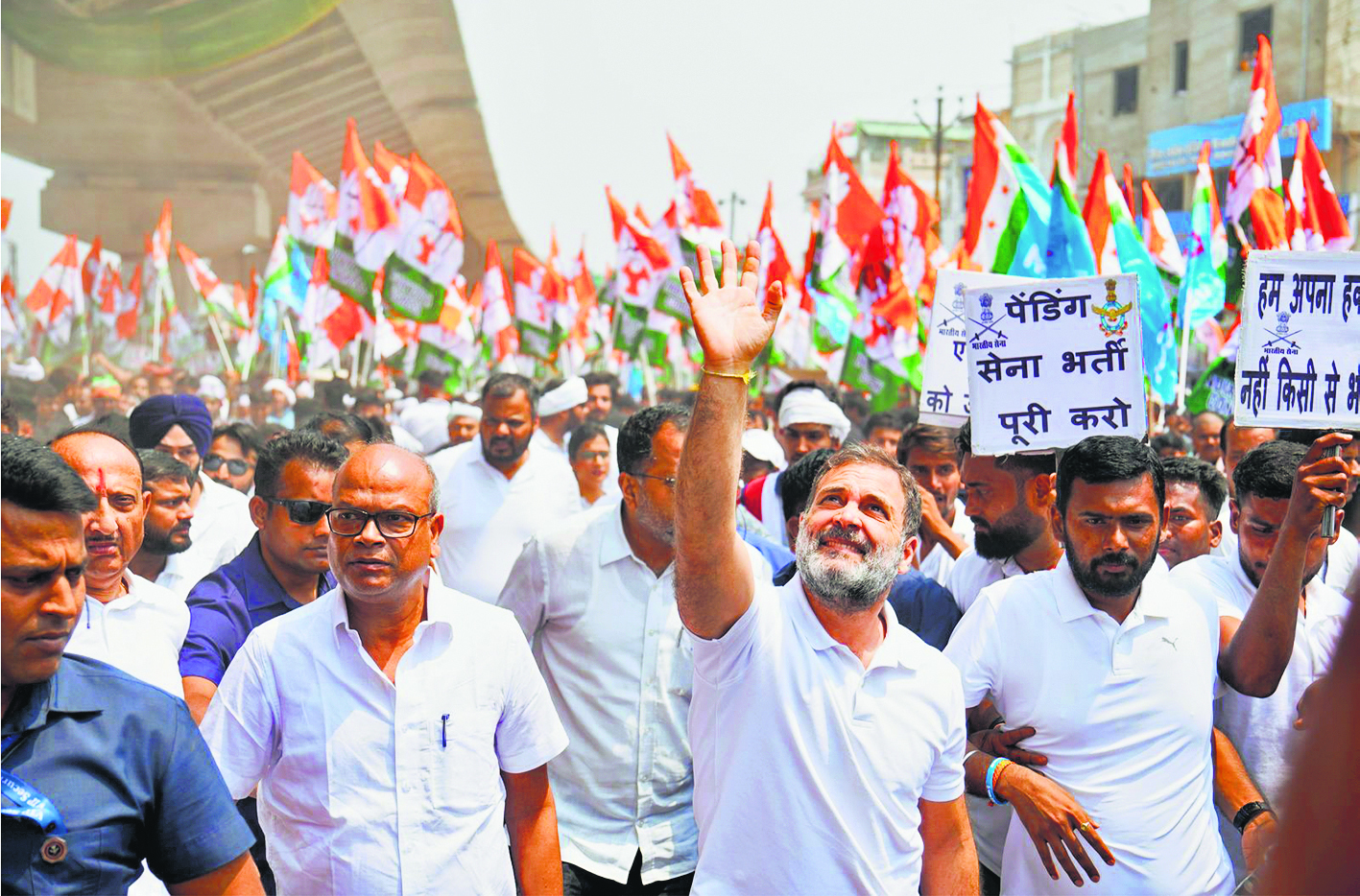 बेगूसराय. सोमवार की सुबह से ही शहर के सुभाष चौक का लुक बदलने लगा था. दर्जनों घोडों का जत्था, व्हाइट टी शर्ट पहने पदयात्री जिसमें महिलाएं और पुरूष दोनों शामिल थे. राहुल गांधी का बेसब्री सेे इंतजार कर रहे थे. राहुल गांधी का हेलीकॉप्टर जैसे ही 10 बजकर 50 मिनट पर उलाव हवाई अड्डा के मैदान में पहुंचा कि हजारों की संख्या में पदयात्रियों का उत्साह बढ़ गया. उलाव हवाई अड्डा से सीधे राहुल गांधी सड़क मार्ग से सुभाष चौक पहुंचे और गाड़ी से उतरकर सीधे पदयात्रा में शामिल हो गये. दर्जनों जेसीबी से पदयात्रियों पर होती रही पुष्पवर्षा