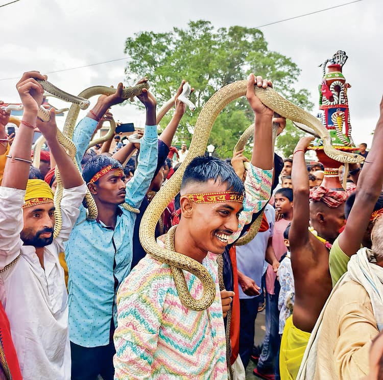 गढ़पुरा. गढ़पुरा प्रखंड के कई गांवों में नागपंचमी के मौके पर भगवती मंदिर दुनहीं के भगत सिकंदर दास ने रक्सी चौक स्थित तालाब से दो दर्जन से अधिक सांप निकाले. इसे देखने के लिए हजारों लोगों की भीड़ तालाब के पास उमड़ी. युवाओं में सांप के साथ सेल्फी लेने की होड़ लगी. जब भगत सिकंदर दास अपने सहयोगियों के साथ सांप लेकर तालाब से निकले तो रक्सी चौक पर ट्रैफिक जाम हो गयी, जिससे आने-जाने वालों को परेशानी हुई. वहीं, कोरियामा भगवती मंदिर परिसर में बकरे की बलि देने वालों की भारी भीड़ थी. स्थानीय भगत बहोर मुखिया ने बताया कि नागपंचमी के दिन यहां कुल 318 बकरे की बलि दी गयी. स्थानीय निवासी उमेश पासवान ने कहा कि यह प्रथा काफी पुरानी है. इस दौरान प्रखंड के विभिन्न भगवती मंदिरों में दूध, लावा, पान, प्रसाद और झांप चढ़ाने वालों की भीड़ रही. भक्तों ने आस्थापूर्वक माता भगवती की पूजा-अर्चना की.