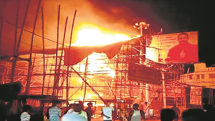 नगर के पॉवर हाउस चौक पर बिजली विभाग कार्यालय के ठीक सामने बन रहे दुर्गा मण्डप के निर्माणाधीन पंडाल में अचानक आग लग गयी. शुक्रवार की रात आग लगने को लेकर देखते ही देखते चीत्कार मच गया. लेकिन बिजली कंपनी के कर्मी व पदाधिकारियों की मुस्तैदी और स्थानीय लोगों की भारी मशक्कत के बाद आग पर काबू पा लिया गया है. जिससे शहर के बीचोबीच इतने बड़े हादसे के बावजूद जानमाल की कोई बड़ी क्षति होने से बचाया जा सका.