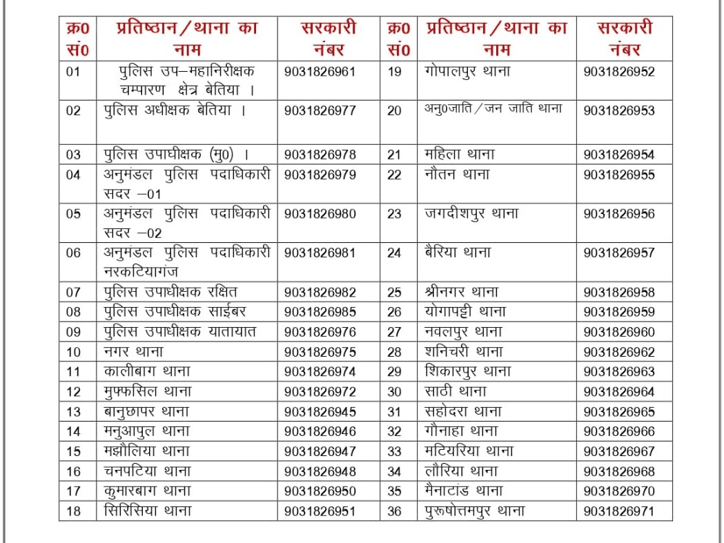 Bihar Police: बेतिया में अब आपात स्थिति में लोगों को थाना जाने की जरूरत नहीं होगी. आम जनता की सहायता के लिए बेतिया के सभी थानों के मोबाइल नंबर सार्वजनिक कर दिए गए हैं. इस नई व्यवस्था के तहत अब आम लोग सीधे थाना प्रभारी से ही संपर्क कर सकते हैं.
