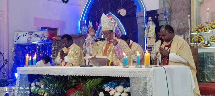 क्रिसमस के मौके पर मंगलवार की मध्यरात्रि नगर के महागिरजाघर नेटिविटी ऑफ द ब्लेस्ड वर्जिन मेरी में आयोजित समारोही मिस्सा को संबोधित करते हुए बेतिया धर्मप्रांत के धर्माध्यक्ष बिशप पीटर सेवास्टियन गोवियस ने उक्त बातें कहीं. उन्होंने कहा कि हम सब क्रिसमस के पूर्व आगमन काल में चार मोमबत्तियां जलाते है. जो विश्वास, प्रेम, शांति और भरोसा का संदेश देती है. क्रिसमस इन सबका संयुक्त उपहार है, जिसे ईश्वर ने हमें प्रदान किया है. क्योंकि हमारा ईश्वर सत्य का ईश्वर है. उसकी प्रतिज्ञा सदैव पूर्ण होती है. समारोही मिस्सा में स्थानीय महागिरजाघर के मुख्य पुरोहित फादर हेनरी फर्नांडो, फादर पंकज पीटर, फादर फ्रांसिस खालको, फादर रौबर्ट तिग्गा सहित हजारों की संख्या में ईसाई धर्मावलंबी मौजूद रहें.महिमा हो, महिमा हो प्रभु की