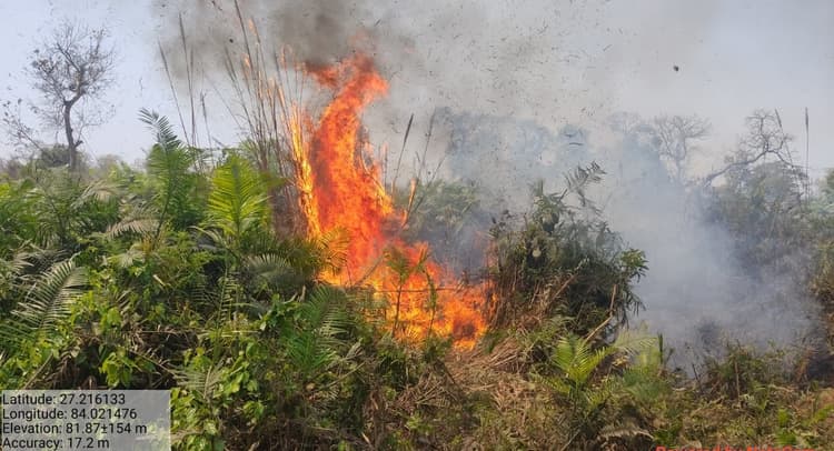 हरनाटांड़ (पचं). जैसे-जैसे गर्मी बढ़ रही है वीटीआर के जंगल में अगलगी की घटनाओं में वृद्धि हो रही है. तीन दिनों से लगातार मदनपुर वन प्रक्षेत्र के जंगल में आग लग रही है. आग की लपटों ने छोटे पौधों और सरीसृप प्रजाति के जीव-जंतुओं को अपनी चपेट में ले लिया है. जंगलों की सुरक्षा के लिए फायर वाचरों व वनकर्मियों की तैनाती के बावजूद आग लगने की घटनाएं चुनौती बनी हुई हैं.शनिवार, रविवार व सोमवार को रामपुर-मदनपुर मुख्य सड़क के अड़गना टोला, गोबरहिया, मदनपुर, सिरिसिया और नौरंगिया गांव के किनारे अचानक आग लगने से सदाबहार जंगल जलकर राख हो गया. बताया जा रहा है कि तेज पछुआ हवा देख शरारती तत्वों ने आग लगा दी. इससे जंगल धू-धू कर जलने लगा. जंगल में सूखे पत्ते ने हवा के झोंके में चिंगारी भड़काने का काम किया. तेज हवा से आग एक जंगल से दूसरे जंगल की ओर फैलती गयी. इसके कारण वनकर्मियों को घंटों मशक्कत करनी पड़ी. आग बुझाने के लिए दर्जनों वनकर्मी, फायर वाचर जुटे रहे. आग से बचने के लिए जंगलों में वास कर रहे वन्यजीव सुरक्षित जगहों की तलाश में भागते रहे. मदनपुर वन प्रक्षेत्र के जंगल में आग को देख इन गांवों के लोग सहम गए थे.