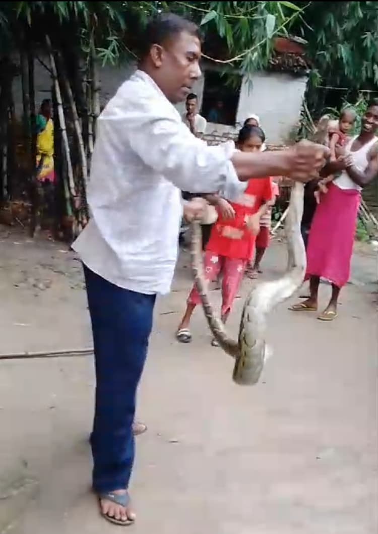 रामनगर. सोनखर पंचायत के मुजरा धुस टोला में मंगलवार को एक ग्रामीण के घर में करीब 10 फिट लंबे अजगर के रेंगने से हड़कंप मच गया. स्थानीय लोगों ने आनन फानन में स्थानीय वन कार्यालय को सूचित किया. जिस पर तुरंत एक रेस्क्यू दल उक्त गांव में पहुंच कर नुरुल होदा के घर से अजगर को कड़ी मशक्कत के बाद पकड़ लिया. अजगर को रिहायशी क्षेत्र के एक घर में घुसा देख स्थानीय लोग सुबह से भयभीत थे. जंगल से दूर गांव के पास सांप आया देख अधिकांश लोग भय से घर में छिप गए. भय के बीच तुरंत ग्रामीणों ने स्थानीय वन विभाग से संपर्क किया. उन्होंने मदद का आश्वासन दिया. फिर वन कार्यालय से पहुंचे वन कर्मियों ने उसे पकड़ लिया. इस बाबत स्थानीय वन कार्यालय के रेंजर विजय प्रसाद ने बताया कि एक अजगर को सोनखर पंचायत के मुजरा धुस टोला गांव से रेस्क्यू किया गया. जिसे जंगल के संरक्षित क्षेत्र में आजाद कर दिया गया.