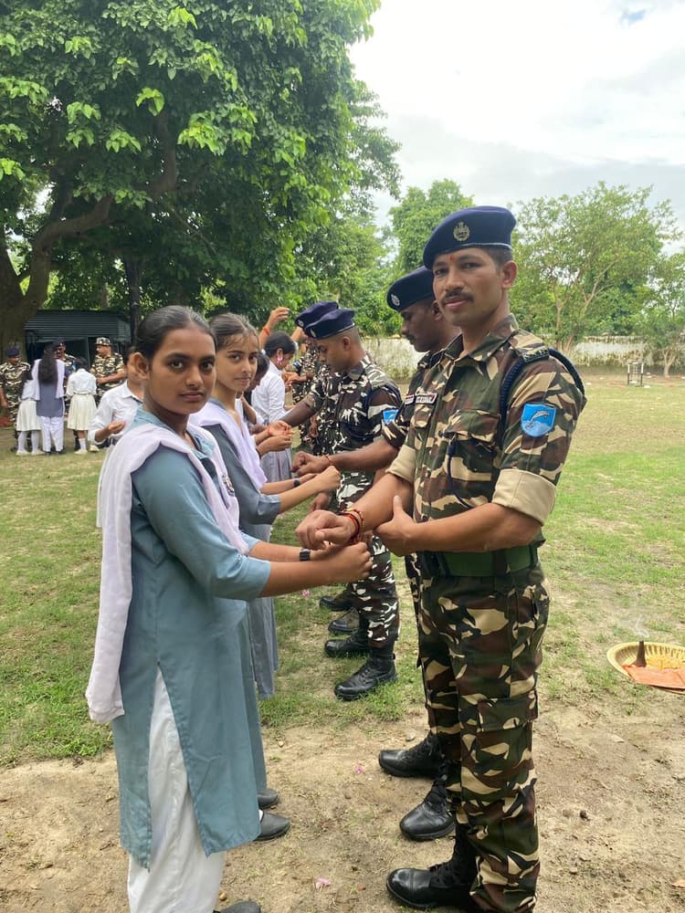 वाल्मीकि नगर. स्थानीय भारत नेपाल सीमा पर सीमा सुरक्षा में तैनात एसएसबी 21 वीं वाहिनी गंडक बराज बी कंपनी के जवानों को रक्षाबंधन के पवित्र त्योहार पर बहनों ने राखी बांध आशीष दी. बताते चलें कि सरहद पर तैनात जवान हर मौसम और पर्व पर अपने घर से दूर देश की सुरक्षा में लगे रहते हैं.जिससे ये जवान रक्षाबंधन के इस त्योहार पर रक्षा सूत्र से वंचित ना हो बहनों ने उन्हें रखी बांध बहनों की कमी का एहसास नहीं होने दिया. इस पावन अवसर पर थाना क्षेत्र के सेंट जेवियर्स स्कूल की बच्चियों ने जवानों के कलाई पर राखी बांध उनकी लंबी उम्र की कामना की. वहीं सीमा जागरण मंच भेड़िहारी द्वारा एसएसबी रमपुरवा पोस्ट पर तैनात निरीक्षक प्रदीप मंडल सहित अन्य जवानों को बहनों द्वारा राखी बांध बहनों और देश की सुरक्षा का वादा लिया. इस मौके पर सीमा जागरण मंच के तापस टैगोर, शक्ति गणपति, बिक्कू कुमार,बिरजू कुमार,दिवाकर कुमार के अलावे अन्य सदस्य मौजूद रहे.