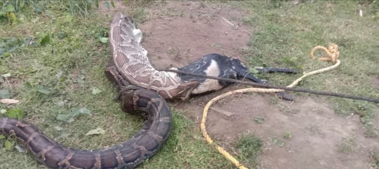 हरनाटांड़. वीटीआर के मदनपुर वन प्रक्षेत्र के जंगल से विशालकाय का अजगर सांप रेंगते हुए लौकरिया थाना क्षेत्र के मतौरा टोला गांव निवासी भीमबली यादव के पशु बथान में पहुंच गया. जहां विशालकाय अजगर ने जिंदा बकरी निगल लिया. बकरी चिल्लाने लगी. लेकिन बकरी को निगलने की वजह से अजगर भी बुरी तरह से फस गया था. वह ना तो उसे बाहर उगल पा रहा था और ना ही पचा पा रहा था. उसका हिलना डुलना भी बंद हो गया था. पशु बथान के किनारे झाड़ियां के पास बैठे अजगर की वजह से पूरे गांव में दहशत का माहौल हो गया. ग्रामीण लाठी डंडे लेकर अजगर सांप के पास पहुंचे तब तक बकरी ने दम तोड दी थी. इसके बाद पशु स्वामी ने वन विभाग को सूचना दी. जिसको गंभीरता से लेते हुए मदनपुर वन प्रक्षेत्र अंतर्गत रामपुर वन परिसर के वनरक्षी सुजीत कुमार ने वन कर्मियों के टीम के साथ घटनास्थल पहुंचे. अजगर को पकड़ा और फिर जंगल में छोड़ दिया. जिसके बाद गांव वालों ने राहत की सांस ली. पशु स्वामी भीमबली यादव ने वन विभाग से मुआवजा की मांग की. वही वनरक्षी सुजीत कुमार ने बताया कि जंगल के किनारे गांव होने के कारण सांप व अन्य जंगली वन्यजीव जंगल से निकलकर रिहायशी क्षेत्रों में पहुंच कर नुकसान कर देते हैं.