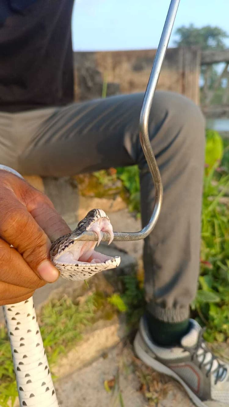 वाल्मीकिनगर. वाल्मीकि टाइगर रिजर्व वन प्रमंडल दो के वाल्मीकिनगर वन क्षेत्र से सटे वन वर्ती इलाकों में वन्यजीवों के निकलने का सिलसिला थमने का नाम नहीं ले रहा है. जिसमें सबसे ज्यादा सरीसृप वर्ग के विषैले सांपों की संख्या है. इसी क्रम में गुरुवार की दोपहर बेहद ही खतरनाक सांप रसेल वाइपर वाल्मीकिनगर थाना क्षेत्र के चरघरिया गांव के नेवार पानी टोला निवासी श्रवण पटेल के घर में जा घुसा. जिसे देख घरवालों में भय व्याप्त हो गया. तत्काल इसकी सूचना वन कार्यालय को दी गयी. सूचना पर पहुंचे स्नेक कैचरों की टीम ने घंटों मशक्कत के बाद सांप का सफल रेस्क्यू कर जटाशंकर वन क्षेत्र में छोड़ दिया. इसकी जानकारी देते हुए रेंजर शिवकुमार राम ने बताया कि रसेल वाइपर सांप का रेस्क्यू कर वन क्षेत्र में छोड़ा गया है. साथ ही बताया कि वन क्षेत्र से रिहायशी क्षेत्र सटे और खुले होने के कारण वन्यजीव ग्रामीण इलाकों में पहुंच जाते हैं. लोगों से अपील है कि सजग और सतर्क रहे.