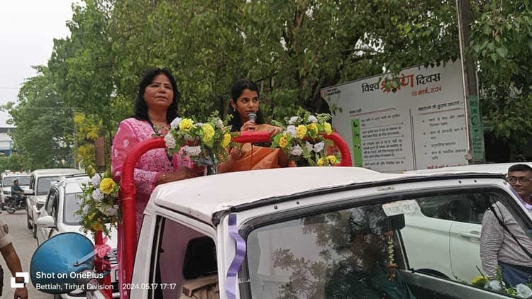 बेतिया.चंपारण के दौरे पर पहुंची लोकगायिका चुनाव आयोग की स्टेट आईकन मैथिली ठाकुर ने शुक्रवार को बेतिया में मतदाताओं को जागरुक करने के लिए रोड शो किया. मैथिली ठाकुर निर्धारित समय से करीब डेढ़ घंटे के बाद समाहरणालय पहुंची जहां एक जिप्सी पर सवार होकर उसने रोड शो किया. रोड शो समाहरणालय से निकलकर मोहर्रम चौक, जनता सिनेमा चौक, कविवर नेपाली पथ आलोक भारती चौक स्टेडियम रोड होते हुए प्रेक्षागृह पहुंची. जहां पहले से प्रेक्षागृह में मौजूद लोगों ने मैथिली ठाकुर का गर्मजोशी से स्वागत किया. सुश्री ठाकुर ने कहा कि पांच साल के बाद आनेवाले लोकतंत्र के इस महापर्व में अपनी भागीदारी सुनिश्चित कराने में आप क्यों चुकते है. उन्होंने कहा कि वोट का कोई कीमत नहीं होता यह अनमोल है. एक वोट आपका देश के भविष्य को तय करता है और यहीं एक अधिकार है कि बिना मांगे 18 वें साल में प्राप्त हो जाता है. इसे व्यर्थ जाया नहीं करें. उन्होंने लोकतंत्र की मजबूती के लिए अपने मताधिकार का प्रयोग हर हाल में करने का संदेश दिया. उन्होंने महिलाओं से आह्वान किया कि इस बार के चुनाव में अधिक से अधिक महिलाएं वोट देने के लिए निकले.
