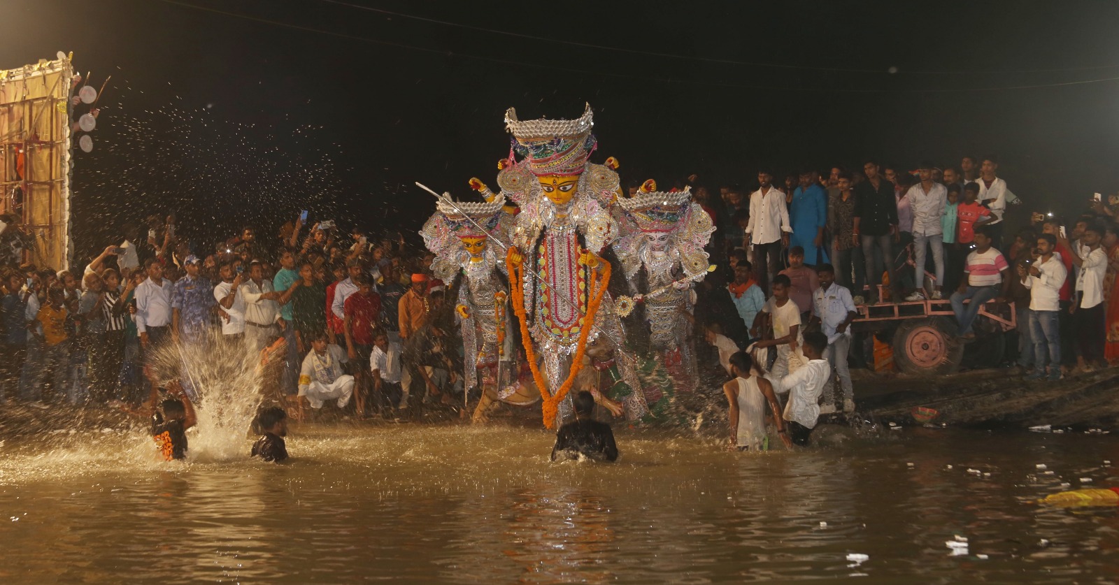 Durga Murti Visarjan PHOTOS: लाइन में सबसे पहले परबत्ती प्रतिमा का विसर्जन तालाब में लगभग रात 7:45 बजे हुआ . बरारी आदमपुर, खंजरपुर सहित कई इलाके की प्रतिमा का विसर्जन बिना कतार में लगा कर हुआ .