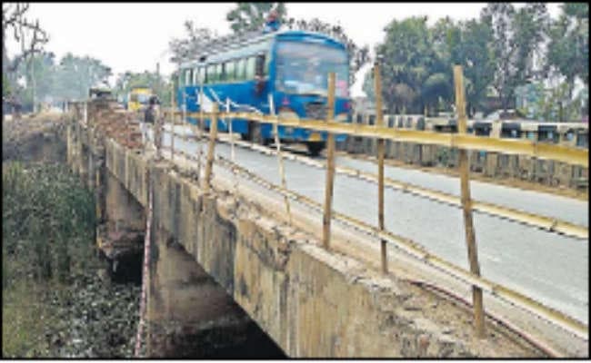 भागलपुर-हंसडीह हाइवे पर मखना, पुरैनी सहित अन्य जगहों पर बने कई पुल जर्जर हैं. इन पुलों की हालत इतनी खराब है कि यह कभी भी गिर सकते हैं. इतना ही नहीं इन पुलों पर लोगों का आना-जाना बदस्तूर जारी है. मखना गांव के पास नाढा नदी पर बना टू-लेन पुल जर्जर है. पुल की रेलिंग वाहनों के धक्के से टूट गया है. सुरक्षा के लिहाज से स्थानीय लोगों ने बांस से घेरा है. तत्काल सुरक्षा के तो प्रबंध कर दिये गये हैं, ताकि कोई हादसा न हो मगर, खतरे की आशंका के बावजूद पुल से भारी वाहनों का परिचालन हो रहा है.