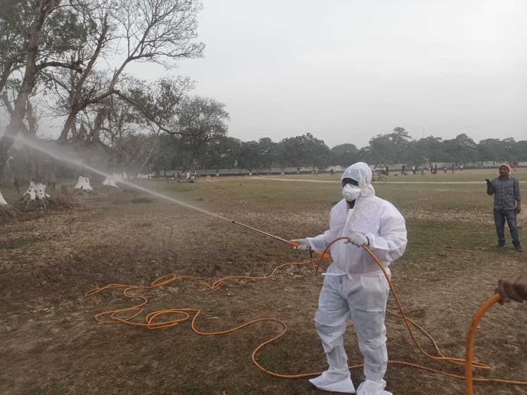नवगछिया अनुमंडल परिसर के मैदान में वर्ड फ्लू को देखते हुए एक किलोमीटर के क्षेत्र को सैनेटाइज किया गया.