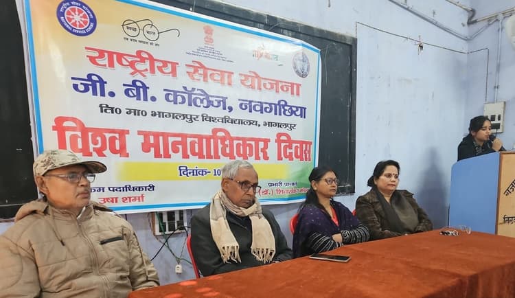 कहलगांव अनुमंडल विधिक सेवा समिति व्यवहार न्यायालय कहलगांव के तत्वावधान में प्रभारी न्यायाधीश सह अध्यक्ष शिल्पा प्रशांत मिश्रा के निर्देशन में अनुमंडल व्यवहार न्यायालय कहलगांव परिसर में मानवाधिकार दिवस पर जागरूकता शिविर का आयोजन किया गया. अवर न्यायाधीश सह अध्यक्ष शिल्पा प्रशांत मिश्रा, अवर न्यायाधीश मो तस्नीम कौसर व मुंसिफ सह सचिव नीलम कुमारी ने मानवाधिकार विषय पर संयुक्त राष्ट्र संघ के प्रस्तावना का वाचन किया. शिल्पा प्रशांत मिश्रा ने बताया गया कि संयुक्त राष्ट्र ने 1950 में 10 दिसंबर को मानवाधिकार दिवस घोषित किया था. उद्देश्य विश्वभर के लोगों को मानवाधिकारों के महत्व के प्रति जागरूक करना और इसके पालन के प्रति सजग रहने का संदेश देना है.अवर न्यायाधीश मो तस्नीम कौसर ने बताया कि मानवाधिकार हमारे रोजमर्रा के जीवन को कैसे प्रभावित करता है. मौके पर न्यायिक पदाधिकारियों के अलावा बार के अध्यक्ष देवेन्द्र पांडे, मुक्तेश्वर साह, ललन सिंह, छोटे लाल उपाध्याय, शंकर साह, शत्रुघ्न शर्मा, रेश्मा कुमारी, रूपम तिवारी के अलावा प्राधिकार के मनीष पांडे, अरविंद कुमार, ओम प्रकाश झा, चंदन नाथ चौधरी, अविकाश सहित बड़ी संख्या में लोग उपस्थित थे. एसएसवी महाविद्यालय कहलगांव में राष्ट्रीय सेवा योजना के बैनर तले कार्यक्रम पदाधिकारी डॉ अजय कुमार व उमाशंकर पासवान के नेतृत्व में विश्व मानवाधिकार दिवस मनाया गया .अध्यक्षता पूर्व प्रभारी प्राचार्य डॉ सिकंदर चौधरी ने की. कार्यक्रम में उपस्थित शिक्षक डॉ निकेश कुमार, डॉ कीर्ति वर्धन गौतम, नमन कुमार, लाल विनीत सिंह, शेखर सुमन, डॉ सुबोध कुमार, डॉ तस्लीम आरिफ, डॉ मधुकर दीक्षित ने अपने विचार व्यक्त किये. राष्ट्रीय मानवाधिकार दिवस पर परिचर्चा का आयोजन नवगछिया. मवि भवानीपुर रंगरा चौक में वरीय सहायक शिक्षक अमित कुमार के नेतृत्व में वर्ग छह के बच्चों के साथ मानवाधिकार दिवस पर परिचर्चा हुई. बच्चों में निबंध प्रतियोगिता में अपनी भागीदारी निभायी. वरीय सहायक शिक्षक ने बच्चों को मोटिवेट कर मानवाधिकार की जानकारी दी. इधर जीबी कॉलेज नवगछिया में राष्ट्रीय योजना के बैनर के लिए प्रभारी प्राचार्य प्रो डॉ शिव शंकर मंडल की अध्यक्षता व कार्यक्रम पदाधिकारी डॉ उषा शर्मा के नेतृत्व में विश्व मानवाधिकार दिवस मनाया गया. डॉ उषा शर्मा ने लोगों के मौलिक अधिकार एवं मानवाधिकार के विभिन्न पहलुओं पर प्रकाश डाला. प्रभारी प्राचार्य ने छात्र-छात्राओं को मानवता को अपने जीवन में उतारने का संदेश दिया.डॉ फिरोज अहमद ने कार्यक्रम को संबोधित किया. कार्यक्रम का समापन राष्ट्रीय गीत से किया गया. कार्यक्रम में डॉ मनोज कुमार, डॉ मंजू कुमारी व स्वयंसेवक प्रज्ञा, साक्षी, निशा, घनश्याम, सौरव