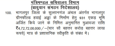 Bihar Cabinet: नीतीश कैबिनेट ने भागलपुर जिले में ग्रीनफील्ड हवाई अड्डे के निर्माण की मंजूरी दी है. इस परियोजना के तहत सुल्तानगंज में 931 एकड़ भूमि का अधिग्रहण किया जाएगा. भूमि अधिग्रहण की प्रक्रिया पूरी करने के लिए सरकार ने 4727200000 राशि की प्रशासनिक स्वीकृति दी है.