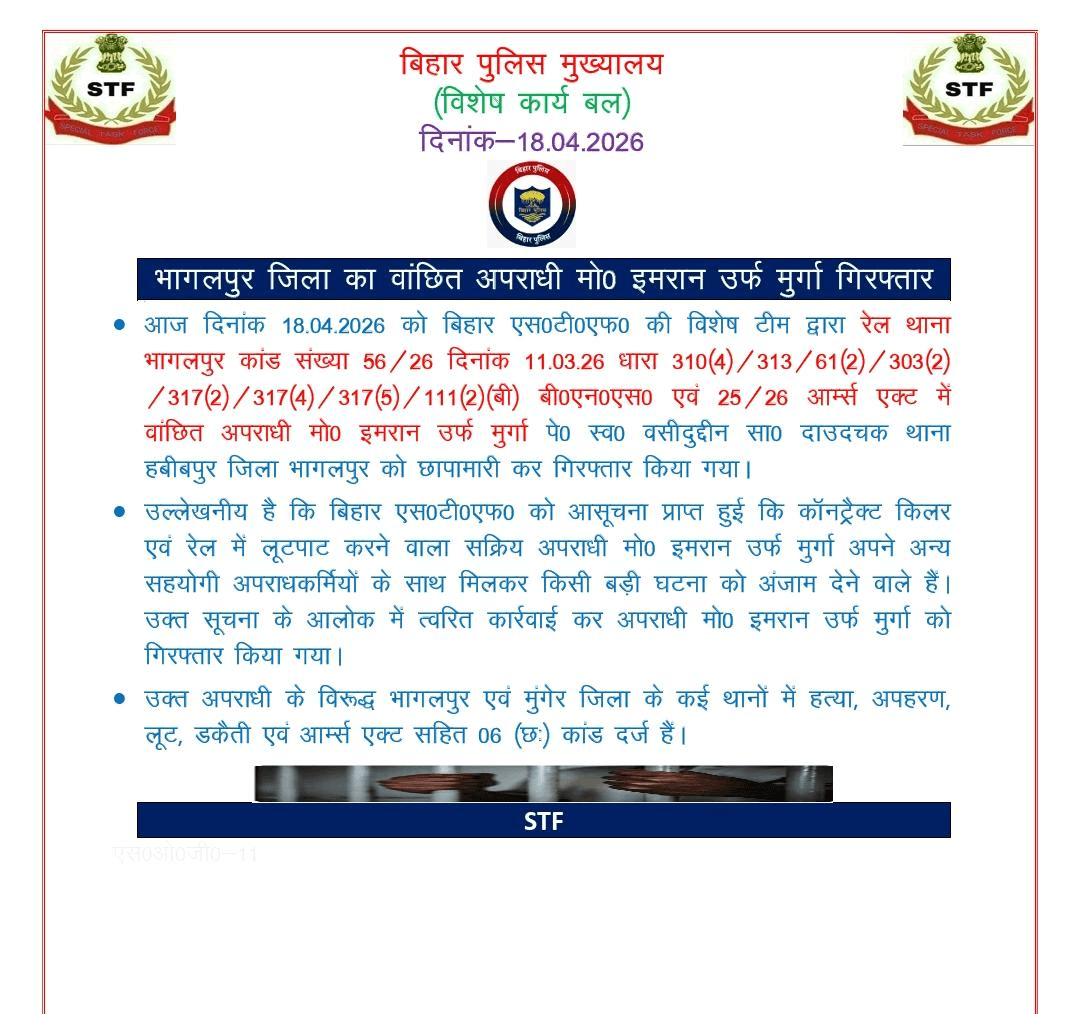Bihar STF: बिहार STF ने बड़ी कार्रवाई करते हुए भागलपुर के कुख्यात अपराधी मो. इमरान उर्फ मुर्गा को गिरफ्तार कर लिया है. वह कॉन्ट्रैक्ट किलिंग और ट्रेनों में लूटपाट करता था. पुलिस को सूचना मिली थी कि वह किसी बड़ी वारदात की तैयारी में है. इससे पहले ही उसे पकड़ लिया गया.