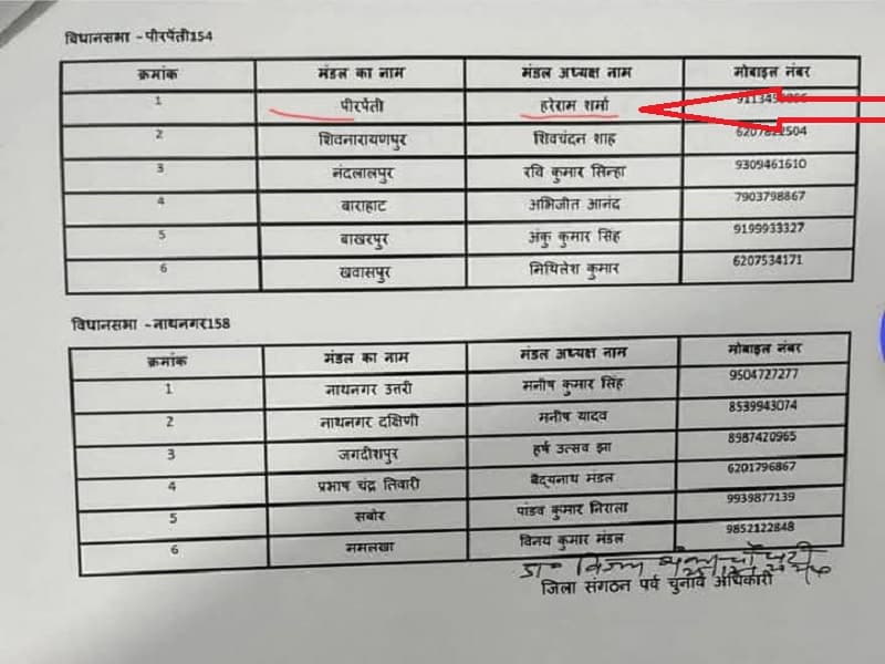 Bhagalpur Bjp News: भागलपुर में भाजपा ने मंडल अध्यक्षों का नाम फाइनल किया तो सिरफुटौव्वल शुरू हो गया. पीरपैंती मंडल अध्यक्ष कौन बनाए गए इसे लेकर कन्फ्यूजन शुरू हो गया.