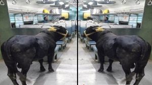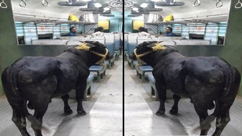 बिहार में रेल की सवारी में आपको हर बार कुछ अनोखा देखने के लिए मिल जाएगा. कहीं लोग पैसेंजर बोगी में अपनी साइकिल मोटर साइकिल लेकर चढ़ जाते हैं तो कहीं घास और जानवरों का चाला लेकर लोग चढ़ जाते हैं. मगर बिहार के भागलपुर के पीरपैंती से अनोखा मामला सामने आया है. यहां ईएमयू पैसेंजर ट्रेन में आमलोगों के साथ एक सांड ने भी सवारी करते दिखा. सांड को देखते ही यात्री दहशत में आ गए. वहीं बोगी में अफरा-तफरी मच गई. अब सांड की फोटो सोशल मीडिया पर वायरल हो रहा है.