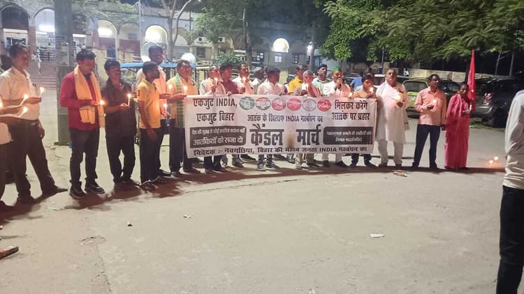 इंडिया गठबंधन के बैनर तले नवगछिया स्टेशन परिसर गोलबंर के पास पहलगाम में आतंकी हमला के विरोध में कैंडल मार्च निकाला गया. पहलगाम में 22 अप्रैल को पर्यटकों पर हुए आतंकवादी हमले में कई लोगों की जान चली गयी और कई घायल हुए हैं. कैंडल जला कर दो मिनट मौन रख मृतकों को श्रद्धांजलि दी गयी. श्रद्धांजलि सभा में वक्ताओं ने कहा कि इस घटना ने कश्मीर में हालात सामान्य होने और राष्ट्रीय सुरक्षा के मामलों में मोदी सरकार के खोखले दावों को उजागर कर दिया है. कश्मीर में आम नागरिकों, प्रवासी मजदूरों और अब पर्यटकों पर आतंकी हमले हो रहे हैं. मिलिटरी की भारी उपस्थिति में आतंकी घटनाएं रुक नहीं रहीं. मौके प्रो रामदेव यादव, प्रो विभांशु मंडल, विंदेश्वरी मंडल, गौरीशंकर राय, संजय मंडल, गौतम कुमार प्रियतम, तनवीर अहमद, हिमांशु कुमार यादव, महेश फौजी, मोहिउद्दीन, राजीव चौधरी, शिवचंद्र सिंह, रामदेव साह, चंद्रशेखर सिंह, अविनाश कुमार, मनोज मंडल, रेणु देवी, रवींद्र मंडल, मनोज शर्मा, संजय सहित सैकड़ों लोग मौजूद थे. गंगोत्री वेल्फेयर फाउण्डेशन बिहार व आदर्श सर्वोदय विद्या मंदिर नवादा अकिदतपुर खरीक ने मृत आत्मा की शांति के लिए कैंडल मार्च निकाला. कैंडल मार्च में प्रो राजेश,गोपाली, धर्मेंद्र, रंजीत रंजन, डॉ सुचित, छोटे सरकार, गौरव आर्या, ब्रजेश, तुलसी, शंकर, राजेश कुमार रवि, किशन कन्हैया, सुनिल, संतोष सुनील, दिवाकर, सुश्री मौसम, अमरजीत, नीरज, आनंद व विद्यालय के लगभग 400 छात्र-छात्राओं ने भाग लिया.