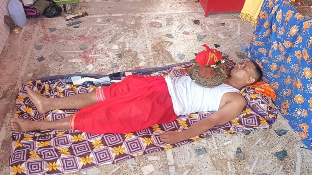 भागलपुर- मुंगेर जिले के सीमा कमराय चौक पर स्थित दुर्गा मंदिर में 24 घंटे सीने पर कलश रखकर एक भक्त दूसरे साल भी हठयोगी साधना कर रहे हैं. नवरात्रि के प्रथम पूजा के दिन पंडित मुकेश कुमार झा द्वारा वैदिक मंत्रोच्चार के साथ 31 वर्षीय विश्वजीत कुमार सिंह ने सीने पर कलश स्थापित कराया है. विश्वजीत की पत्नी अवंतिका देवी ने कहा कि पूरे नौ दिनों तक किसी भी प्रकार का आहार नहीं लेते हैं. केवल चेहरा को तुलसी और गंगाजल से पोछा जाता है.विश्वजीत सिंह दूसरी साल मां के दरवार में सीने पर कलश स्थापित कराई गई है, और तीन साल करवायेंगे.