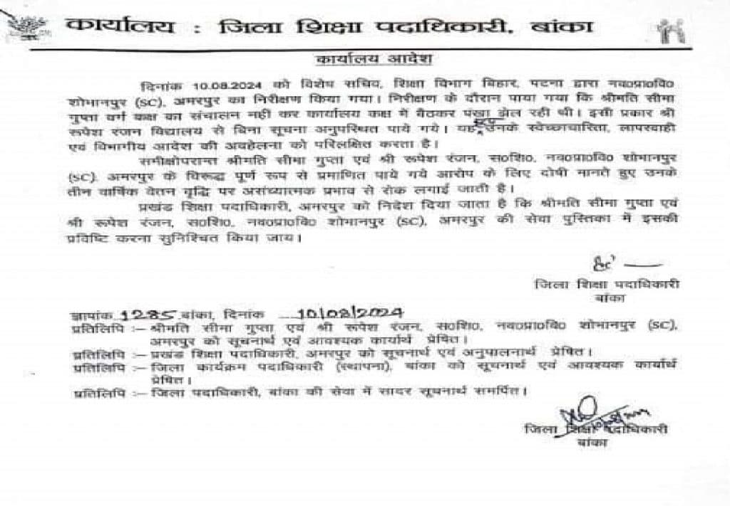 जिस मामले में शिक्षिका शबनम कुमारी के विरुद्ध भी आगामी तीन वर्षों तक वेतन वृद्धि पर रोक लगायी गयी है. इसके अलावा विशेष सचिव के द्वारा अमरपुर के छत्रहार, शंभुगंज के हस्तीनापुर, राजघाट, इटवा, बुधुडीह, भूमिहारा, झालूचक आदि विद्यालयों का औचक निरीक्षण किया गया. और स्कूल परिसर की साफ-सफाई, किचन शेड की व्यवस्था, पेयजल व शौचालय की सुविधा आदि का अवलोकन किया गया. बताया जा रहा है इसके अलावा अन्य शिक्षकों के विरुद्ध भी कार्रवाई हुई है.