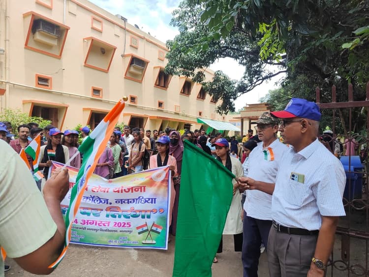 जीबी कॉलेज राष्ट्रीय सेवा योजना इकाई द्वारा हर घर तिरंगा का आयोजन कार्यक्रम पदाधिकारी डॉ उषा शर्मा के नेतृत्व में किया गया. आयोजन की अध्यक्षता प्रभारी प्राचार्य प्रो शिव शंकर मंडल ने करते हुए छात्रों को तिरंगा के इतिहास एवं इसकी महत्ता के बारे में बताया. कार्यक्रम की शुरुआत एनएसएस गीत से हुई. इसके बाद हर घर तिरंगा अभियान पर रैली निकाली गयी. जिसे प्राचार्य प्रो शिव शंकर मंडल, डॉ मनोज कुमार, डॉ फिरोज अहमद, डॉ राजकुमार, डॉ दिव्या प्रियदर्शी, डॉ मुसर्रत हुसैन एवं डॉ सुनील ने रवाना किया. रैली कॉलेज परिसर, पोषित गांव मील टोला, स्टेशन रोड, रसलपुर से होते हुए महाविद्यालय में आकर संपन्न हुई. स्वयंसेवकों ने सब लोगों को अपने घर तिरंगा लगाने का अनुरोध करते हुए हर घर तिरंगा अभियान को सफल बनाने का संदेश दिया. तिरंगा यात्रा को सफल बनाने में डॉ चंदा, डॉ श्वेता, डॉ भावना डॉ हामिद अली, डॉ राजीव, डॉ रंजीत, मुकेश जी एवं स्वयंसेवक छोटू, नेहा ,रोशन ,सौरव, संचित आदि का महत्वपूर्ण योगदान रहा.डिस्क्लेमर: यह प्रभात खबर समाचार पत्र की ऑटोमेटेड न्यूज फीड है. इसे प्रभात खबर डॉट कॉम की टीम ने संपादित नहीं किया है