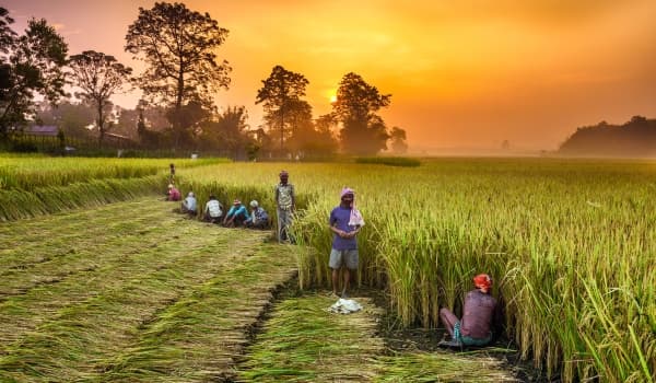 CHITWAN, NEPAL - OCTOBER 24, 2015 : Nepalese people working in a rice field at sunrise. In Nepal, the economy is dominated by agriculture. (CHITWAN, NEPAL - OCTOBER 24, 2015 : Nepalese people working in a rice field at sunrise. In Nepal, the economy i