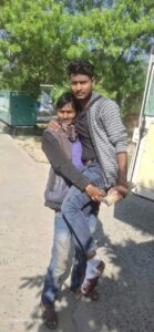 गंभीर रूप से घायल युवक को स्ट्रेचर उपलब्ध न होने से उसके भाई को उसे गोद में उठा कर एम्बुलेंस तक ले जाता