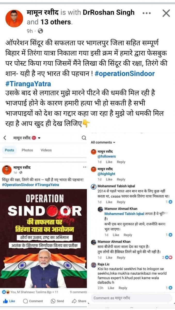 भागलपुर में भाजपा अल्पसंख्यक प्रकोष्ठ के मीडिया प्रभारी मामून रशीद ने उस पोस्ट का स्क्रीनशॉट लगाया जिसमें उन्हें धमकी दी गयी. दरअसल, भाजपा नेता ने ऑपरेशन सिंदूर की सफलता पर हुई भाजपा तिरंगा यात्रा से जुड़ा एक पोस्ट लगाया था. जिसमें पीएम मोदी की भी तस्वीर थी. पोस्ट में मामून रशीद ने लिखा कि ‘सिंदूर की रक्षा, तिरंगे की शान- यही है नए भारत की पहचान.’ इस पोस्ट पर कई लोगों ने अपनी प्रतिक्रिया दी.