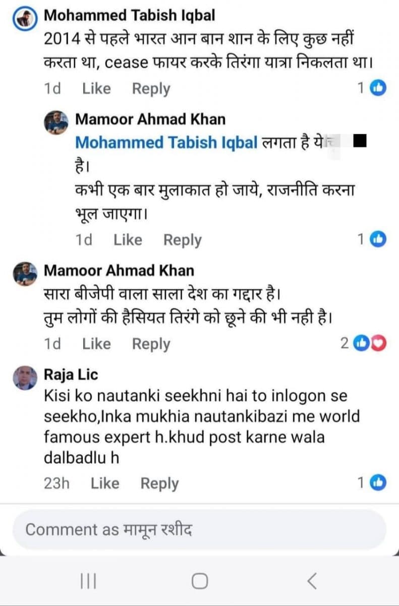 इसी पोस्ट पर मोहम्मद ताबिश इकबाल नाम के एक यूजर ने लिखा- ‘2014 से पहले भारत आन-बान-शान के लिए कुछ नहीं करता था. सीजफायर करके तिरंगा यात्रा निकलता था.’ जिसपर एक यूजर ममूर अहमद खान ने धमकी भरे लहजे में अभद्र भाषा का प्रयोग करते हुए लिखा- ‘कभी एकबार मुलाकात हो जाए, राजनीति करना भूल जाएगा.’ मामूर अहमद खान ने अगले कमेंट में सारे भाजपाइयों को गद्दार भी बताया.’