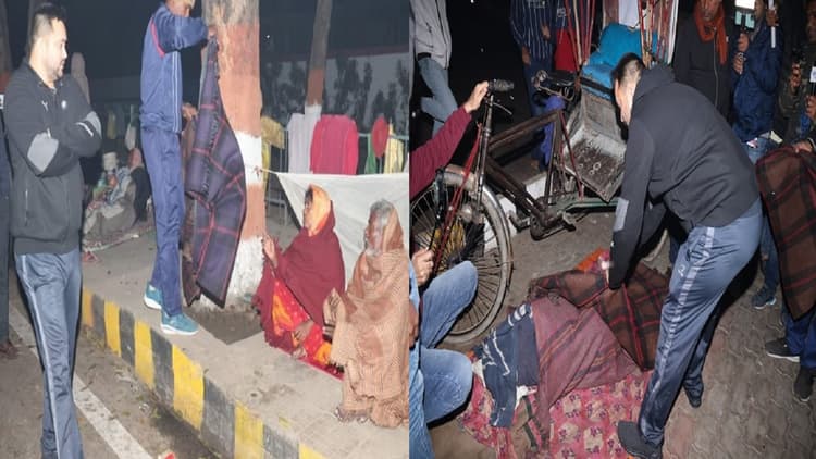 फुटपाथ पर सोने वाले गरीबों को कंबल से ढका
