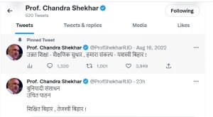 बिहार के शिक्षा मंत्री प्रो चंद्रशेखर का एक ट्वीट अब नये विवाद को सामने ला चुका है. शिक्षा मंत्री बनने के बाद यशस्वी बिहार का ट्वीट करने वाले प्रो चंद्रशेखर ने अब रामचरितमानस विवाद के दौरान ही तेजस्वी बिहार लिखकर नये विवाद को पैदा कर दिया.