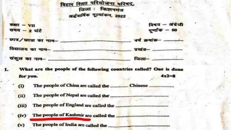 किशनगंज में बिहार परियोजना परिषद द्वारा ली जारी सरकारी विद्यालय की सातवीं कक्षा की अर्द्धवार्षिक परीक्षा की अंग्रेजी भाषा के प्रश्न पत्र में अन्य देशों के नागरिकों को क्या कहा जाता है. इसी सूची में कश्मीर से जुड़ा प्रश्न होना लोगों के बीच चर्चा का विषय बन चुका है. प्रश्न संख्या एक में यह प्रश्न पूछा गया है कि चीन, नेपाल, इंगलैंड, इंडिया के नागरिकों को क्या कहा जाता है इसी में कश्मीर के नागरिकों को किया कहा जाता है. मामले में भाजपा ने हमला करते हुए कहा है कि यह प्रश्न देश की एकता व अखंडता को कलंकित करने वाला है तथा स्पष्ट है कि कश्मीर को भारत से अलग दिखाने की कोशिश की गयी है. यह एक सोची-समझी साजिश का हिस्सा हो सकती है. ऐसे मामले में संबद्ध पदाधिकारी को कठोर कदम उठाने की आवश्यकता है. इस संबंध में जिला शिक्षा पदाधिकारी सुभाष कुमार गुप्ता ने कुछ भी बोलने से बचते दिखे. पूरे मामले पर आशा लता मध्य विद्यालय के प्रधानाध्यापक का कहना है की ऐसा होना नहीं चाहिए था.