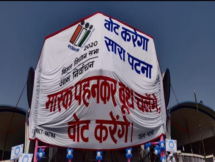 Bihar Election News: कोरोना काल में हो रहे बिहार चुनाव के मद्देनजर पटना जिला प्रशासन ने विश्व का सबसे बड़ा मास्क बनाया है. मतदाताओं को मास्क पहनने के लिए जागरूक करने के लिए 850 वर्ग फुट का मास्क बनाया गया है. बताया जाता है कि सौ से अधिक लोगों ने 15 दिनों की मेहनत के मास्क को तैयार किया.