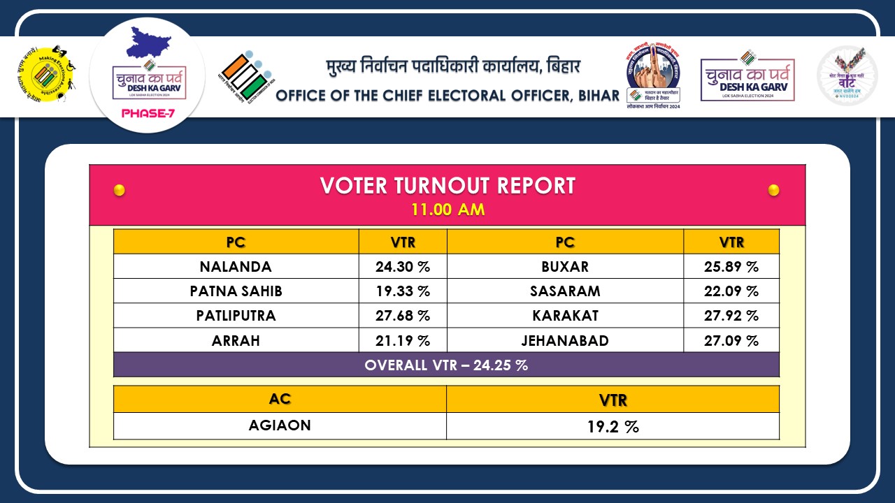 Bihar Lok Sabha Election 2024 Phase 7 Voting : बिहार में 8 संसदीय सीटों पर मतदान जारी है. सुबह 11 बजे तक का मतदान प्रतिशत चुनाव आयोग ने जारी किया है. सबसे अधिक काराकाट में वोट पड़े हैं.