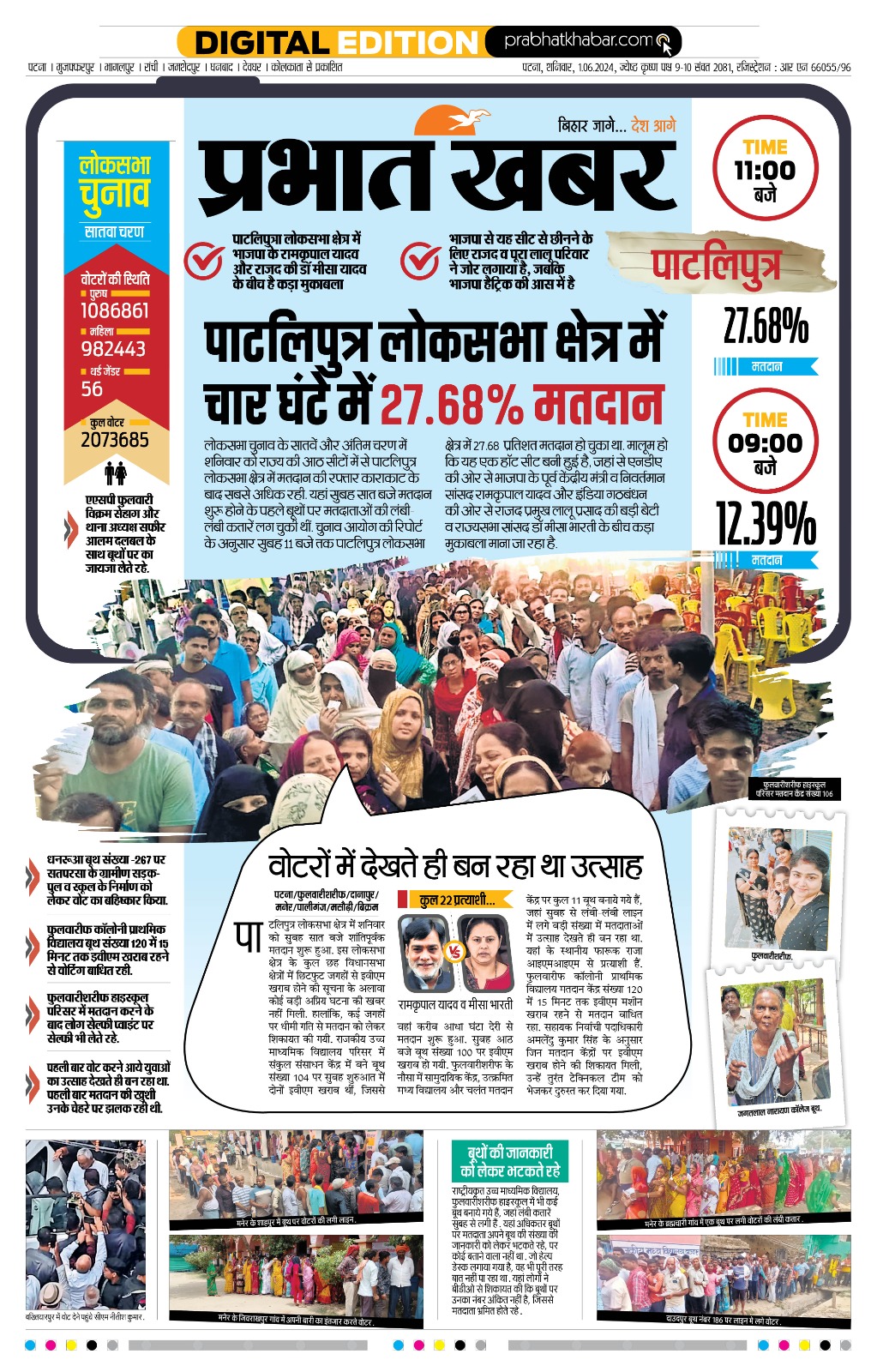 Patliputra Lok Sabha Chunav Live: पाटलिपुत्र में 11 बजे तक 27.68 प्रतिशत मतदान हुआ है. प्रभात खबर का डिजिटल संस्करण मतदान की झलकी लेकर आया है..