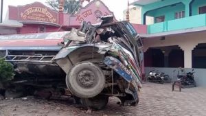 बिहार: मंदिर की रेलिंग तोड़ते हुए तेल का टैंकर पलटा, रिसाव से आसपास के लोगों में मचा हड़कंप, पुलिस अलर्ट