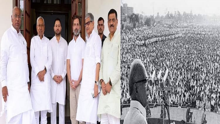 वर्ष 1974 में लोक नायक जयप्रकाश नारायण ने केंद्र की सरकार के खिलाफ संपूर्ण क्रांति का नारा दिया था. उस वक्त केंद्र में कांग्रेस की सरकार हुआ करती थी. जयप्रकाश नारायण के आंदोलन में दलों की सीमायें टूट गई थी. उस दौरान कई दलों का विलय करके 23 जनवरी 1977 में जनता पार्टी का गठन हुआ था. जिसके बाद, चुनाव में कांग्रेस को हार का सामना करना पड़ा. जनता पार्टी में जनसंघ का विलय हुआ था. उस दौरान जयप्रकाश नारायण ने महंगाई, बेरोजगारी और लोकतंत्र की रक्षा जैसे मुद्दों पर आंदोलन की शुरूआत की थी. यह एक बड़ा संयोग है कि इस बार भी विपक्षी दलों का मुद्दा यही है.