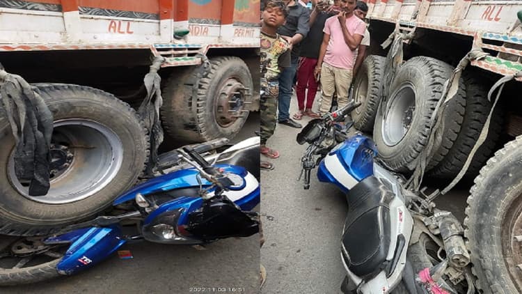 ट्रक के नीचे आई बाइक, बाल-बाल बचे सवार