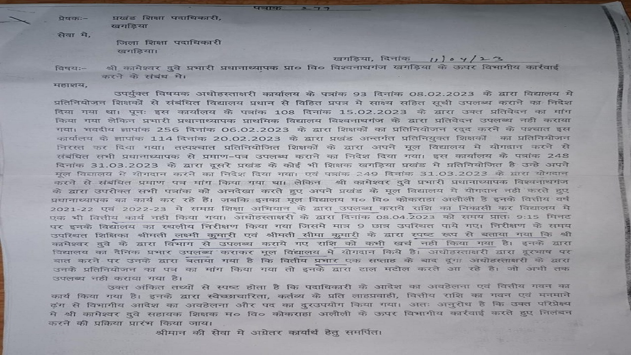 पदाधिकारी के आदेश की अवहेलना, वित्तीय अनियमितता, सरकारी राशि का गबन, स्वेच्छारिता, कर्तव्य के प्रति लापरवाही, मनमाने ढंग से विभागीय आदेश की अवमानना, पद के दुरूपयोग के आरोप में मध्य विद्यालय कोकराहा (अलौली) के सहायक शिक्षक (पूर्व एचएम, प्रावि कोकराहा) कामेश्वर दूबे के निलंबन की अनुशंसा डीईओ से की गयी है.